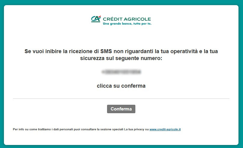– Il link indicato appartiene ad un dominio di terzo livello che è di effettiva proprietà di Crédit Agricole: è un collegamento reale ad un pulsante che consente di non ricevere più, dalla banca, comunicazioni non collegate a questioni di operatività